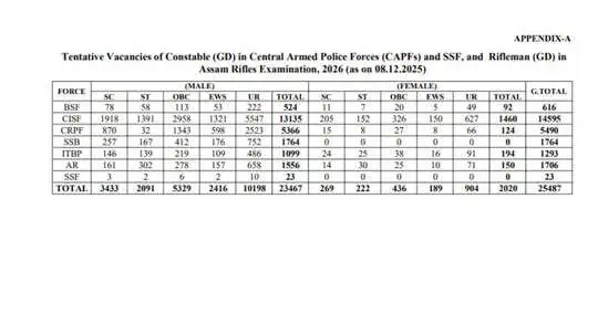 कर्मचारी चयन आयोग ने केंद्रीय सशस्त्र पुलिस बलों (CAPFs), सचिवालय सुरक्षा बल (SSF) और असम राइफल्स में राइफलमैन (जनरल ड्यूटी) में कांस्टेबल (जनरल ड्यूटी) भर्ती के लिए राज्यवार रिक्तियों का विवरण जारी कर दिया है। कुल 25,487 पदों पर भर्ती प्रक्रिया जारी है। आधिकारिक अधिसूचना के मुताबिक आवेदन की आखिरी तारीख 31 दिसंबर 2025 है। वहीं आवेदन शुल्क जमा करने की आखिरी तारीख 1 जनवरी 2026 (है, जबकि एप्लीकेशन फॉर्म में सुधार के लिए विंडो 8 जनवरी से 10 जनवरी खुली रहेगी।